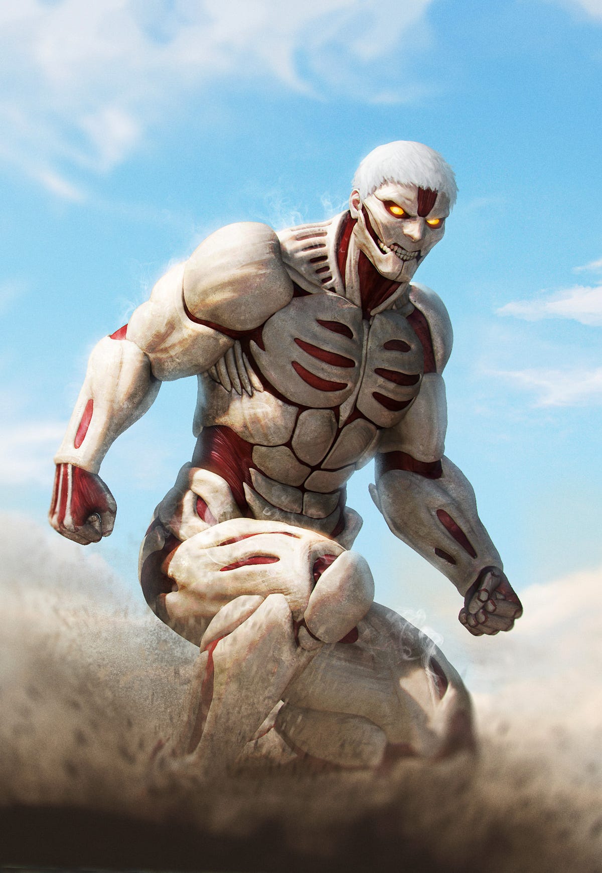 Reiner's armored titan form is 15 meters tall and has white plates of hardened skin covering the entirety of its body, except for muscles in its cheeks that become exposed when it opens its lipless it is currently in the possession of reiner braun, although gabi braun is a candidate considered to in.
